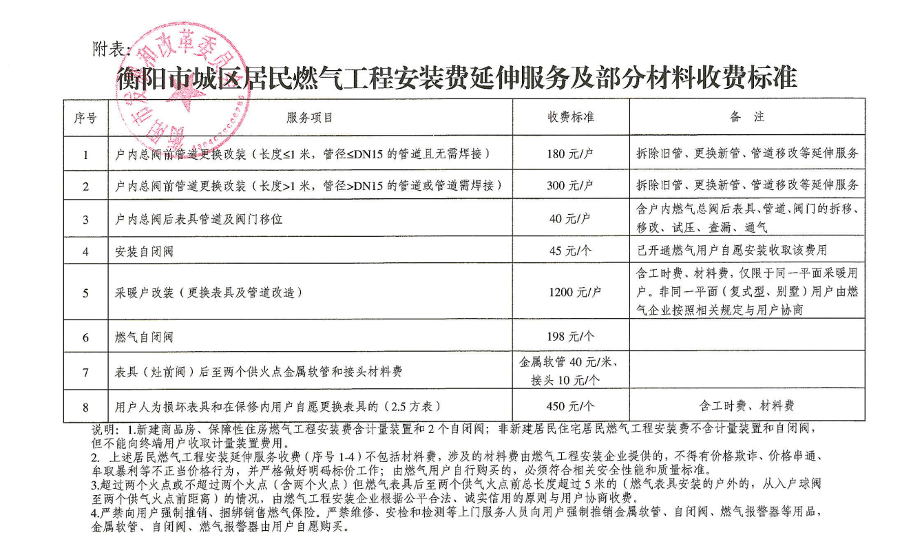 根據(jù)衡陽市發(fā)展和改革委員會《關(guān)于規(guī)范市中心城區(qū)燃?xì)夤こ贪惭b收費有關(guān)事項的通知》(衡發(fā)改價商〔2024〕2號)文件規(guī)定: